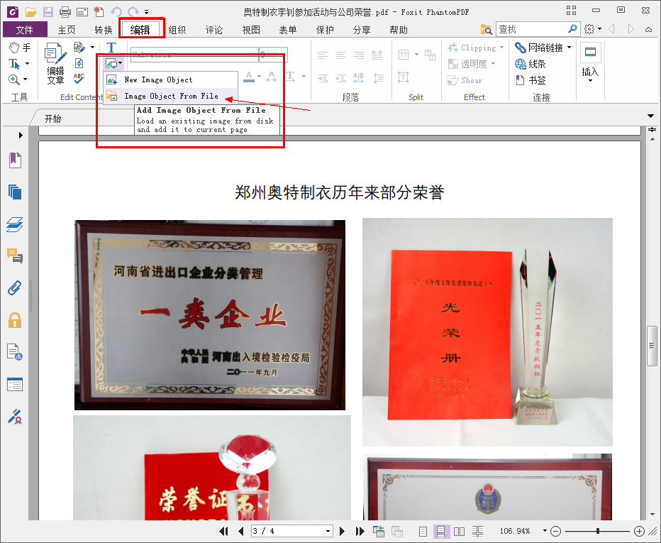 使用剛剛下載安裝好的Foxit PhantomPDF打開之前另存為的pdf文件,依次點(diǎn)擊“編輯”工具欄,使用Add Image–Image Object From File 從文件插入圖片: