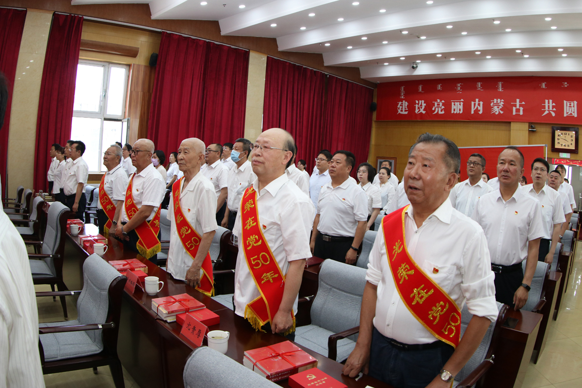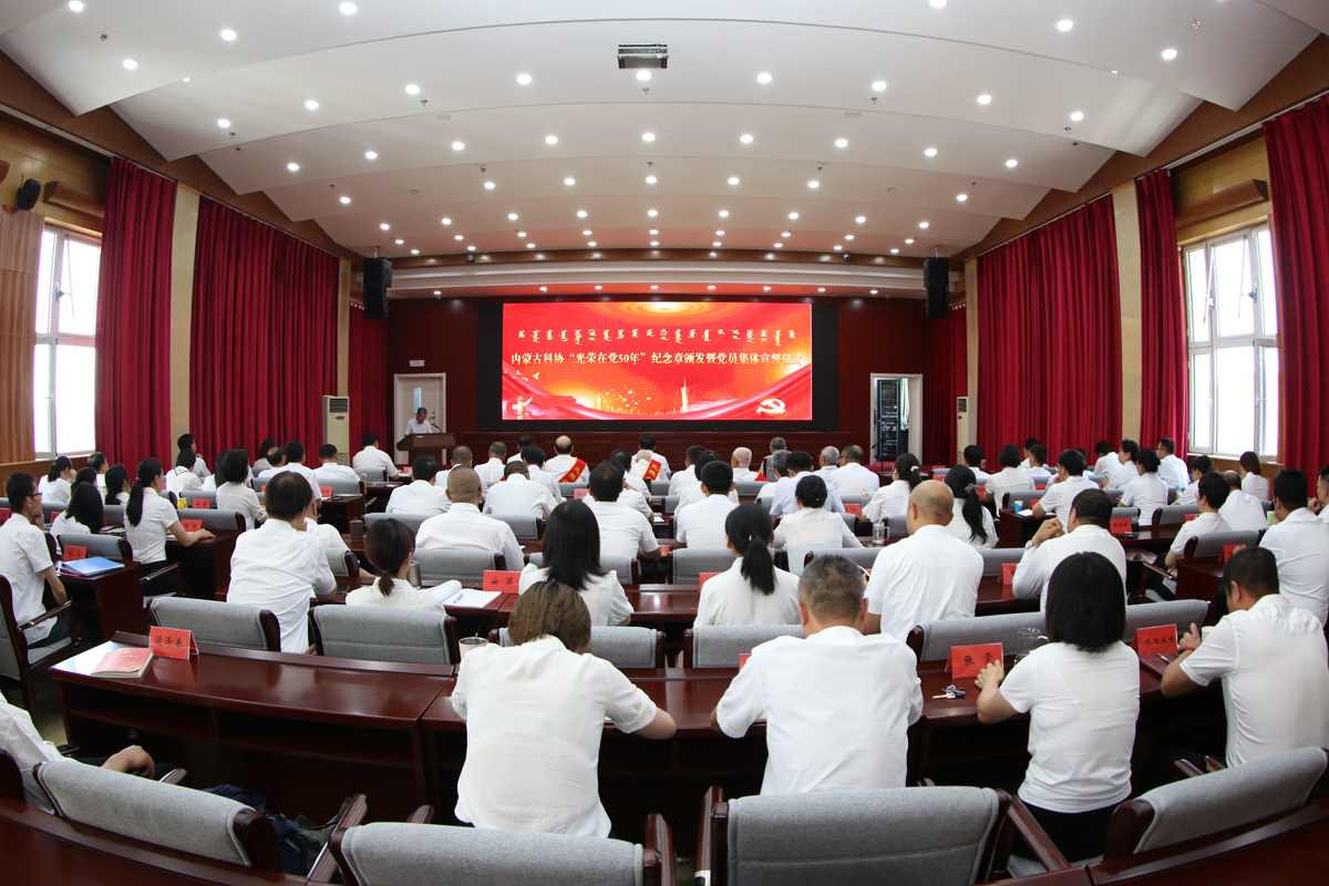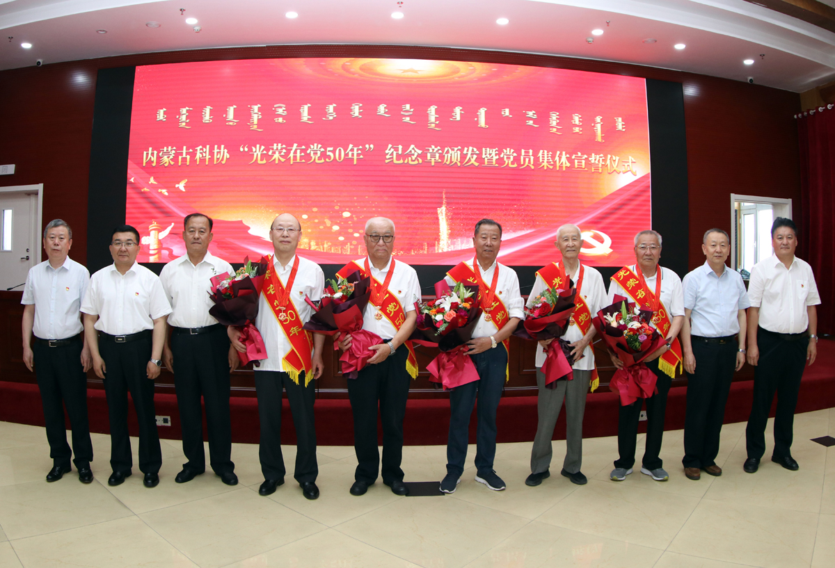 6月29日,內(nèi)蒙古科協(xié)舉行“光榮在黨50年”紀(jì)念章頒發(fā)暨黨員集體宣誓儀式。自治區(qū)黨委黨史學(xué)習(xí)教育第十一巡回指導(dǎo)組組長(zhǎng)周志寧,內(nèi)蒙古科協(xié)黨組書記麻魁,主席趙吉,黨組成員、副主席蘇雅來(lái)出席儀式,黨齡滿50年以上的畢力格圖、崔景錄、亢貴厚、格格爾、楊善5位原自治區(qū)科協(xié)老領(lǐng)導(dǎo)、老同志,自治區(qū)科協(xié)機(jī)關(guān)、事業(yè)單位全體黨員干部,2021年新發(fā)展黨員、入黨積極分子參加儀式。內(nèi)蒙古科協(xié)黨組成員、副主席榮昌平主持儀式。
