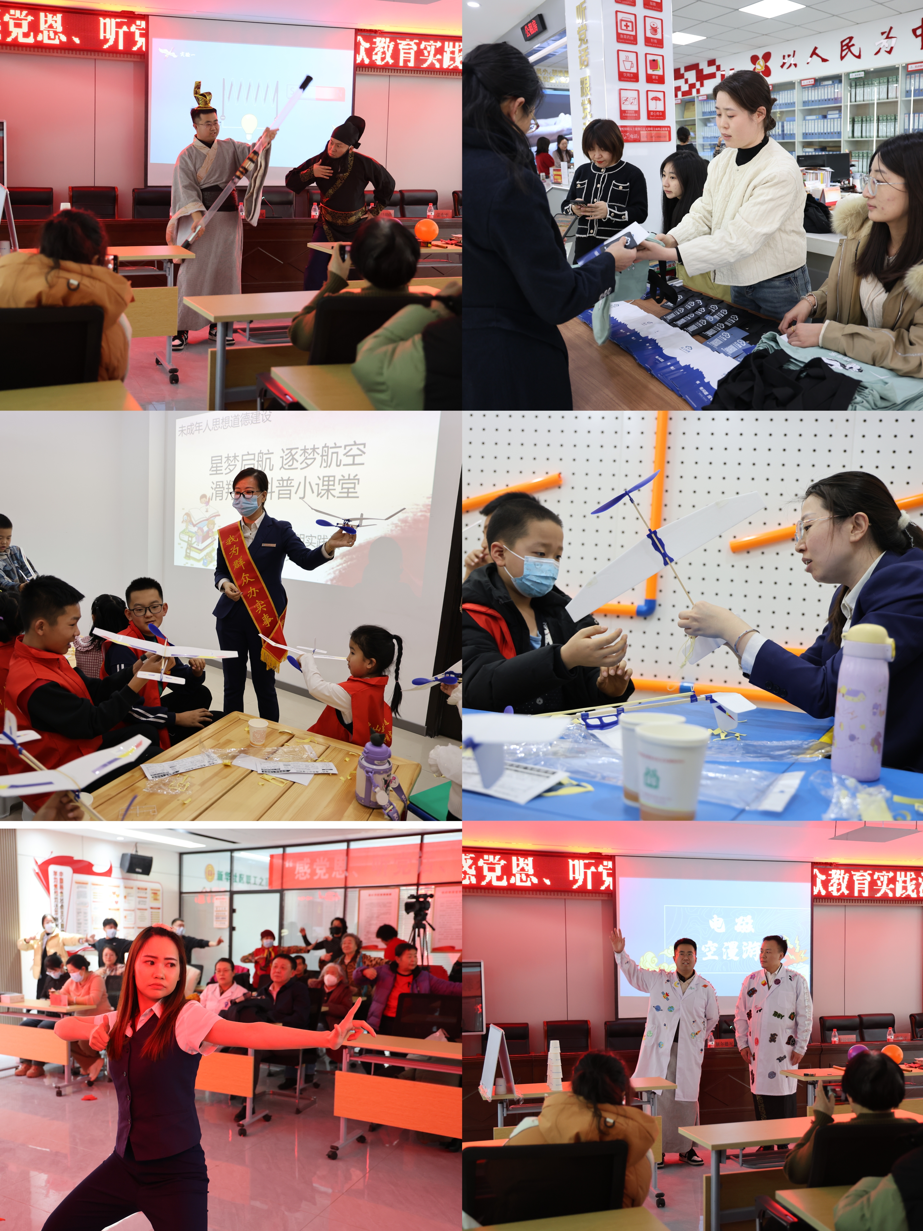 走進社區(qū)服務大廳,志愿者正忙著幫助社區(qū)居民下載、安裝、注冊“云上科普”APP,并幫助老年人從微信視頻聊天、微信語音轉文字、線上支付、網(wǎng)上訂票、網(wǎng)絡購物、預約掛號等常用的功能入手,學習使用手機軟件,進行一對一的講解和問題答疑??茖W教室內(nèi),小朋友被形式多樣,創(chuàng)意十足的科普器材和教具吸引,孩子們帶著好奇和疑惑,緊緊跟隨老師的思路去認識探索,一起動手制作神奇的滑翔機,學習興趣瞬間被激發(fā)。會議室內(nèi),人頭攢動,歡呼聲不斷,科學實驗室的老師們?yōu)榇蠹規(guī)砹艘粓鰟e開生面的科普大餐,穿越回三國的現(xiàn)代版諸葛先生正在利用現(xiàn)代科技手段,挫敗吳軍。妙趣橫生的滑稽表演,捧腹大笑的現(xiàn)場互動,將活動推向高潮。