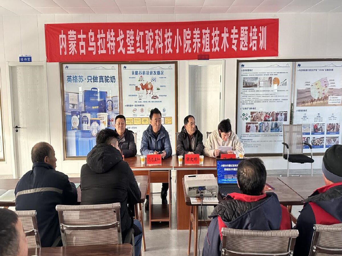 為破解戈壁紅駝產(chǎn)業(yè)發(fā)展技術(shù)瓶頸,提升企業(yè)和牧民科學(xué)養(yǎng)殖水平,推動產(chǎn)業(yè)向規(guī)?;?、標準化、高質(zhì)量方向邁進,11月23日,烏拉特后旗科協(xié)聯(lián)合內(nèi)蒙古戈壁紅駝科技小院(依托單位為內(nèi)蒙古英格蘇生物科技有限公司),在烏拉特后旗萬峰紅駝養(yǎng)殖專業(yè)合作社舉辦戈壁紅駝養(yǎng)殖技術(shù)專題科普培訓(xùn)。烏拉特后旗萬峰紅駝養(yǎng)殖專業(yè)合作社工人、各蘇木鎮(zhèn)現(xiàn)有養(yǎng)殖從業(yè)者、意向養(yǎng)殖戶及基層畜牧技術(shù)推廣人員等近60人參與培訓(xùn)。